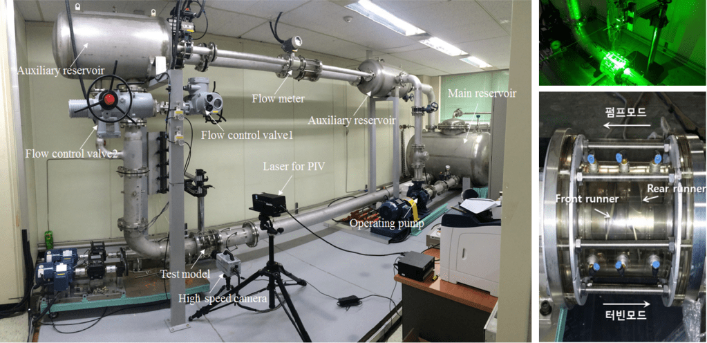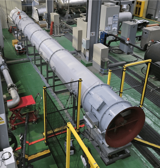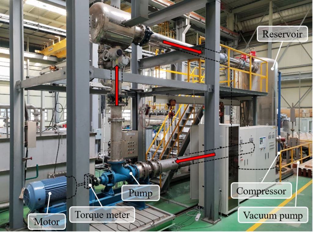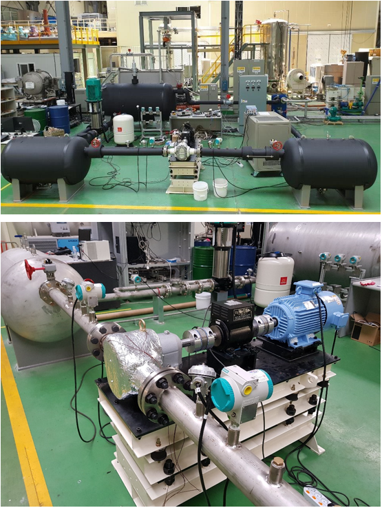 ISO 5198 & ANSI/HI 1.6 standards, Closed-loop experimental set-up, Maximum standard deviation of the measuring instruments: ±0.2% (pressure gauges, temperature sensor, magnetic flow meter, and torque meter), Certificated annually, Flow rate control: two gate-type valves, Pressure control: vacuum pump & compressor, Torque meter applied, Maximum flow rate: 15 m3/min, Maximum pressure: 20 bar, Reservoir: 8.65 m3, Pipe diameter: 200A, 125A, 50A, NPSH test available