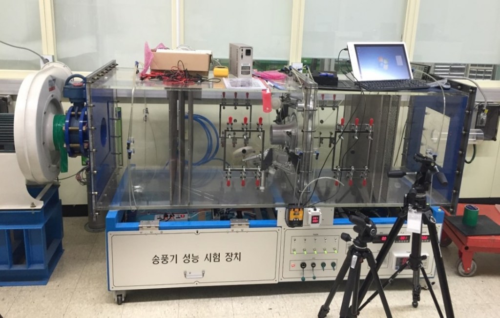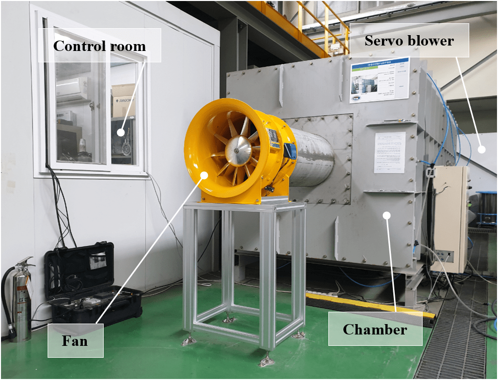 ANSI/AMCA 210-07 standards, Chamber type set-up, Uncertainty of measurement: dry bulb temperature detectors, 0.07 °C for the measuring range of 0-60 °C; pressure manometers, 0.001-0.005 kPa for the measuring range of 0-1.33 kPa; stroboscope, 0.1-1 rpm for the measuring range of 40-35,000 rpm, Certificated annually, Flow rate control: eight nozzles inside the chamber & a servo blower behind the chamber, Power meter applied, Maximum flow rate: 240 m3/min, Transient measurement available